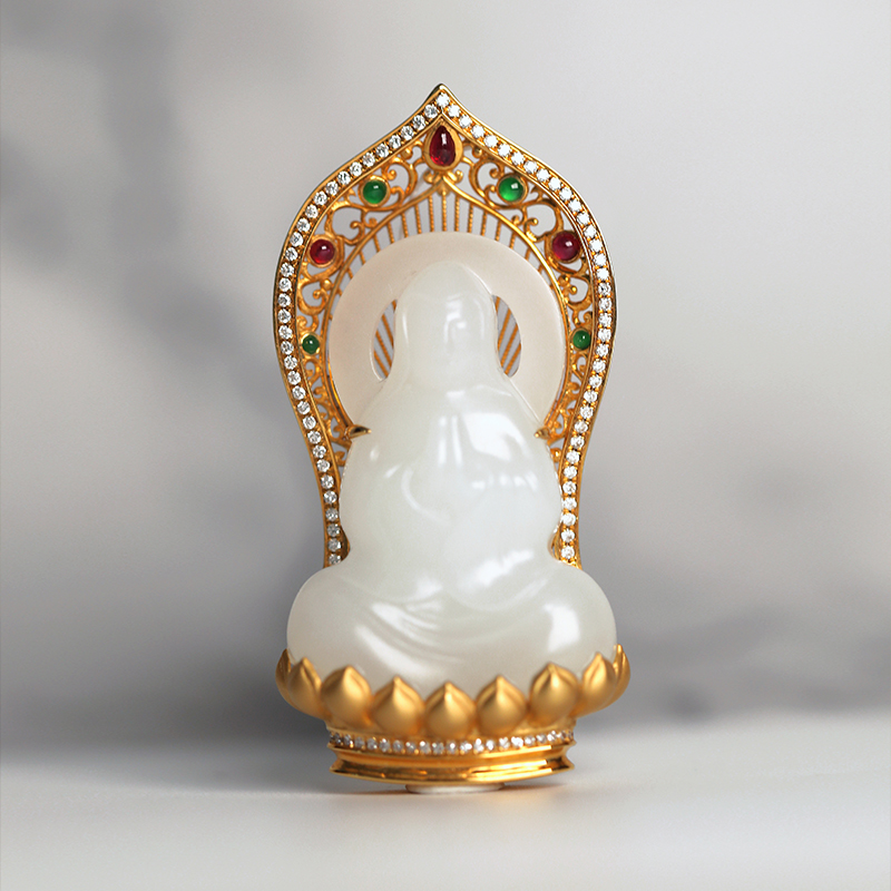 观音立于金线勾勒的莲台之上,玉质如月光凝脂,寓意“慈航普渡,佛光护佑”。